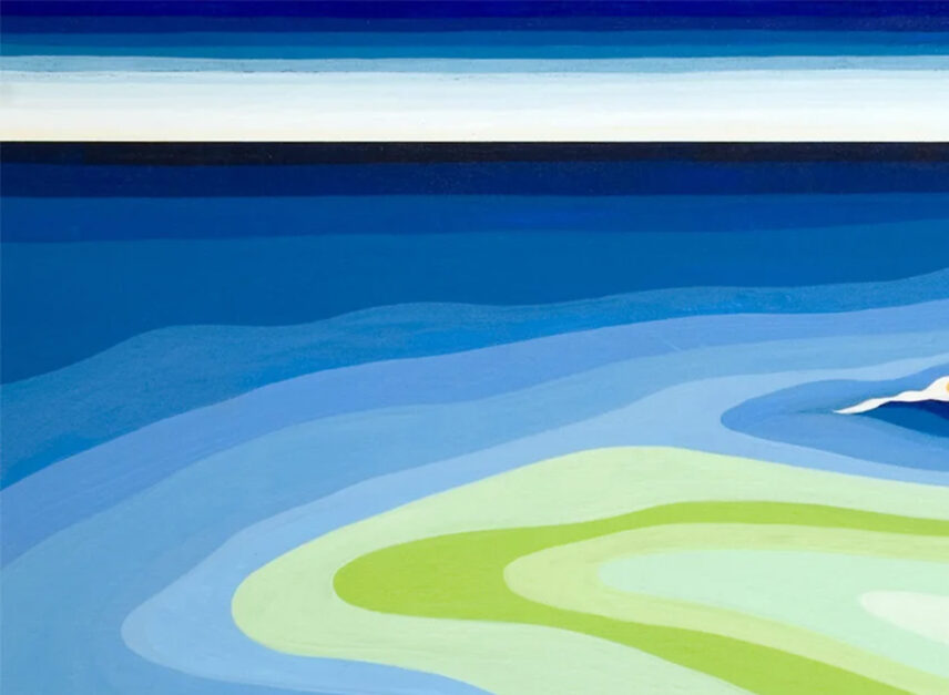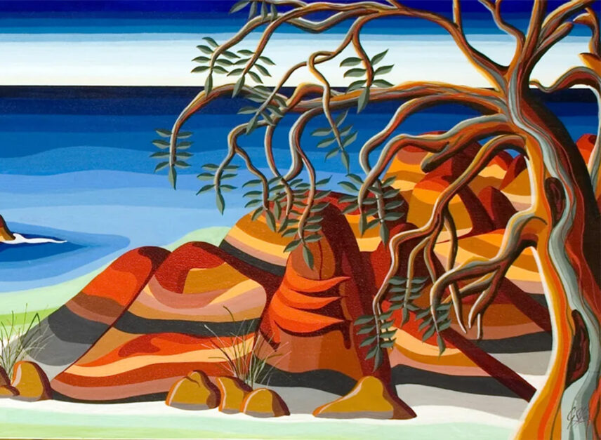 Reds and oranges blaze across coastal boulders, meeting cool blues of the sea. A twisted tree anchors the vivid landscape.
