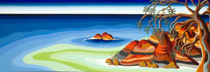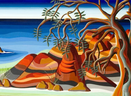 Reds and oranges blaze across coastal boulders, meeting cool blues of the sea. A twisted tree anchors the vivid landscape.