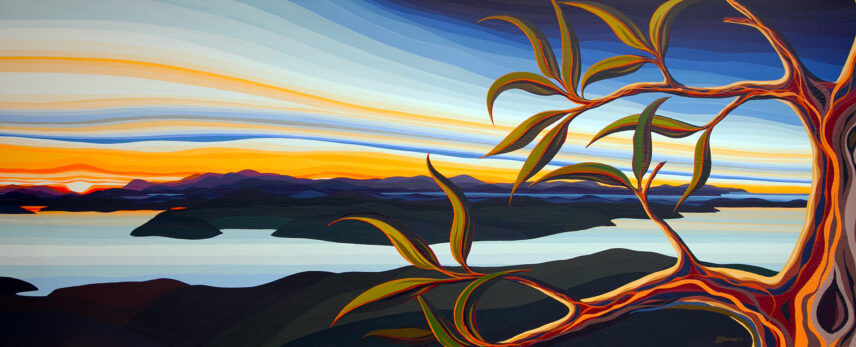 Sunrise over Bruny Island frames the Dentrecasteaux Channel on the shortest day of the year. Eucalyptus branches and layered colours celebrate the beauty of winter’s rebirth.
