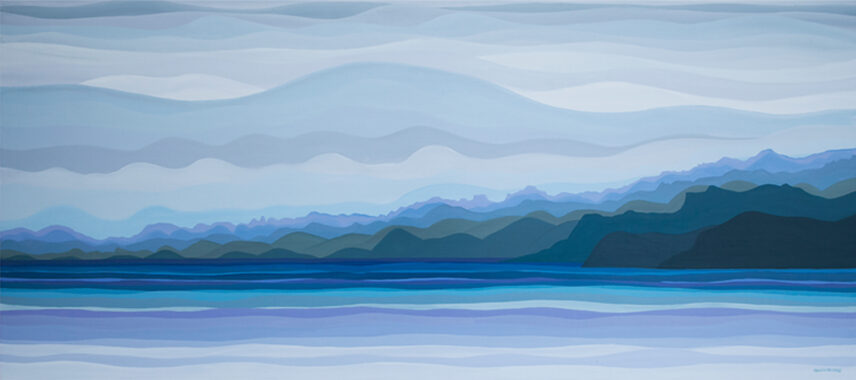 Ancient ranges rise over the calm waters of Lake Pedder. Cool tones and soft skies speak of vastness and quiet.