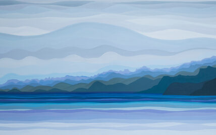 Ancient ranges rise over the calm waters of Lake Pedder. Cool tones and soft skies speak of vastness and quiet.