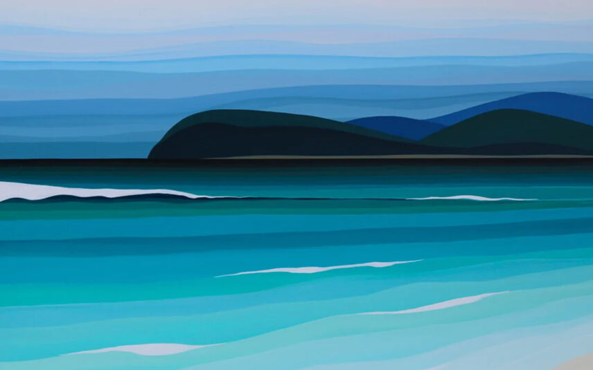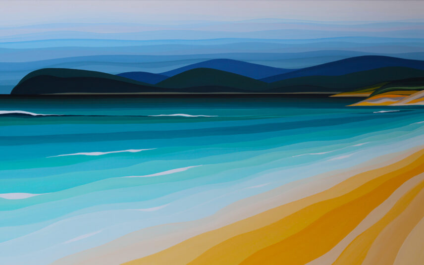 Forecast Change Gentle waves brush golden sand as hills fade into the distance. The calm scene hints at the weather turning.