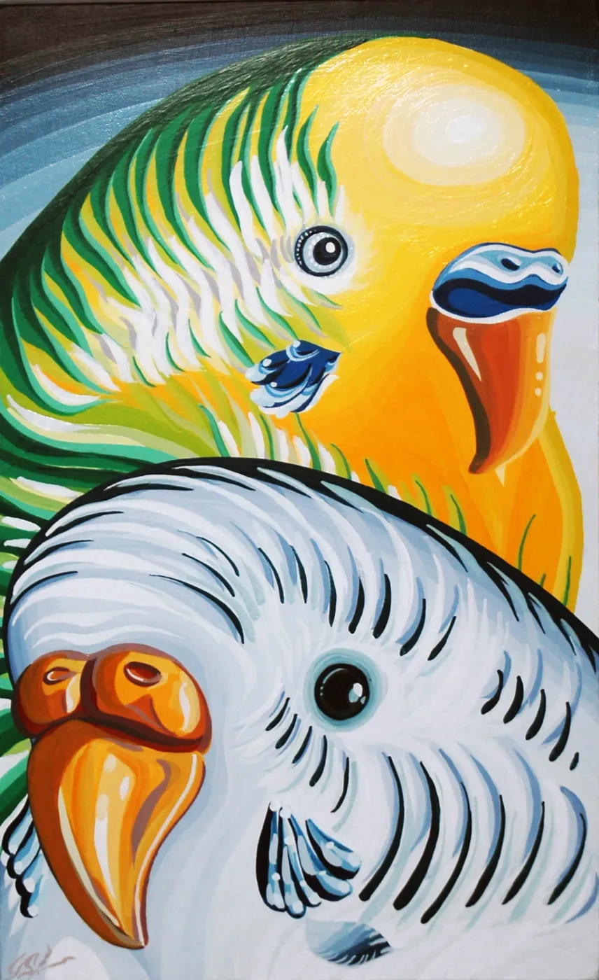 Frank and Molly Two budgies, bright and full of life, perch close together. Their colours sing of joy and companionship.