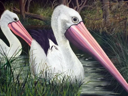 Two pelicans stand in still water, pink bills bright. The scene feels unhurried and graceful.