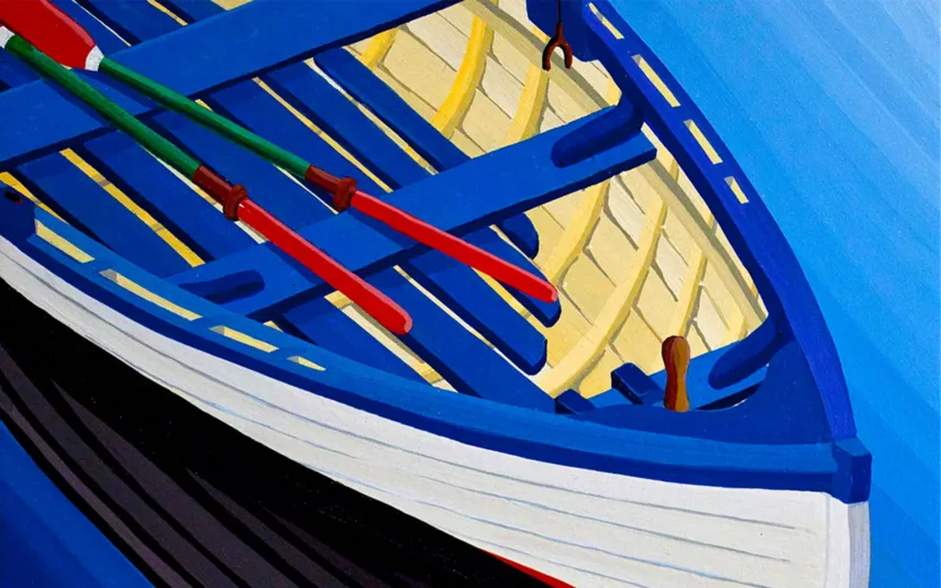 A rowboat rests in calm water, its oars painted red and green. The composition captures the warmth of a slow summer day.