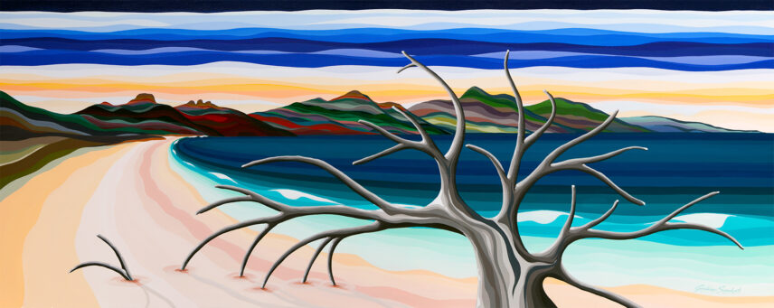 A weathered tree frames the quiet waters of Wineglass Bay. The painting reflects resilience and time’s steady passage.